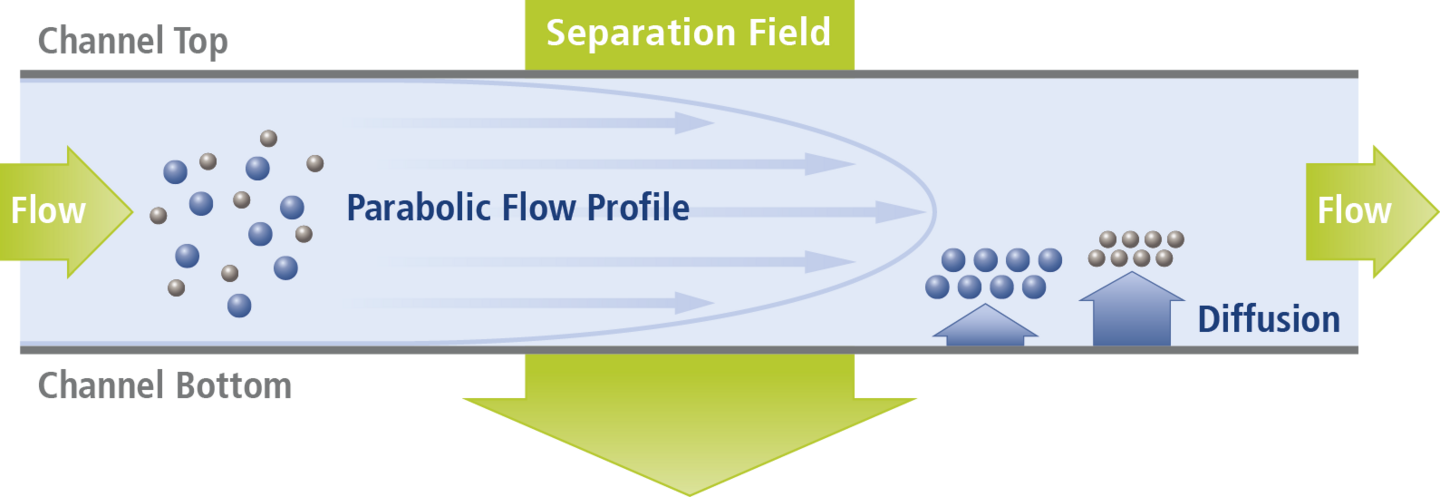 フィールド・フロー・フラクショネーションは、液体媒体中の 1 nm から 100 μm までの粒子状物質を高速、穏やか、 かつ高分解能で分離します。サンプルは、内部に充填剤や固定相が存在することがない、オープンチャネル内で分離されます。