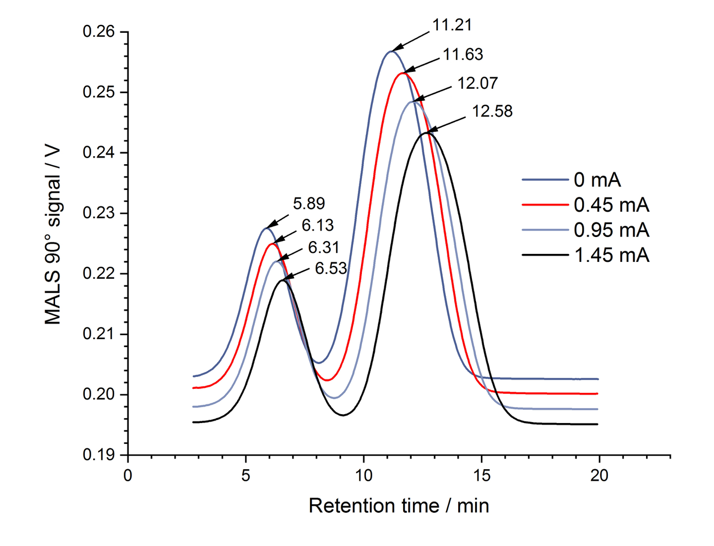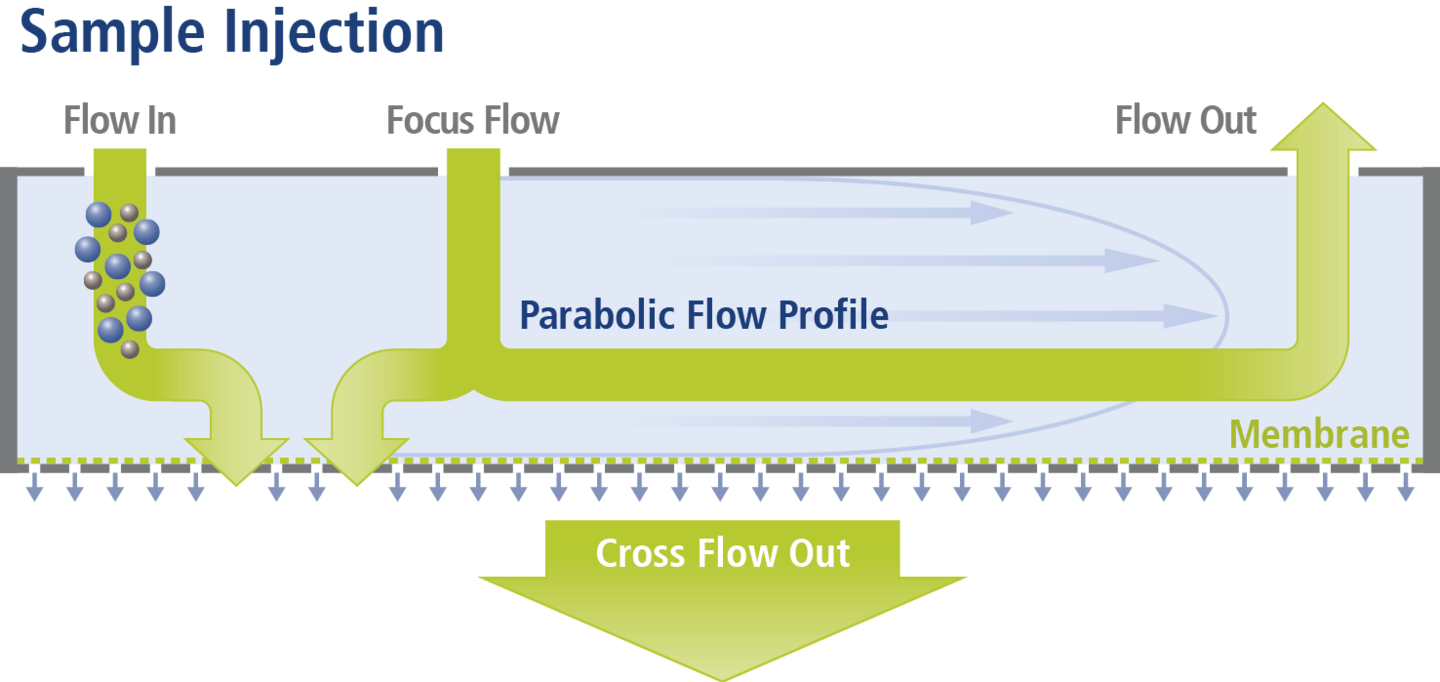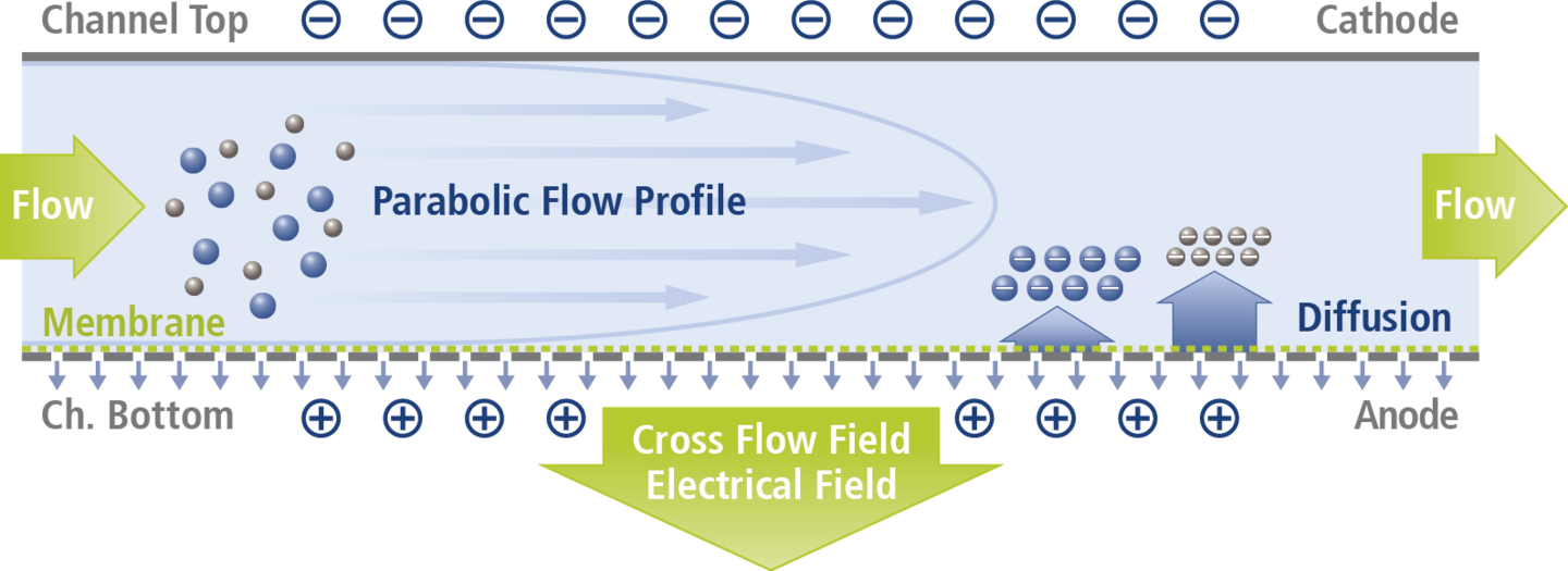 これにより、クロスフローフィールドによって誘導される粒子サイズとモル質量の分離が可能になり、さらに電場によって誘導される電気泳動移動度による電荷分離も可能になります。