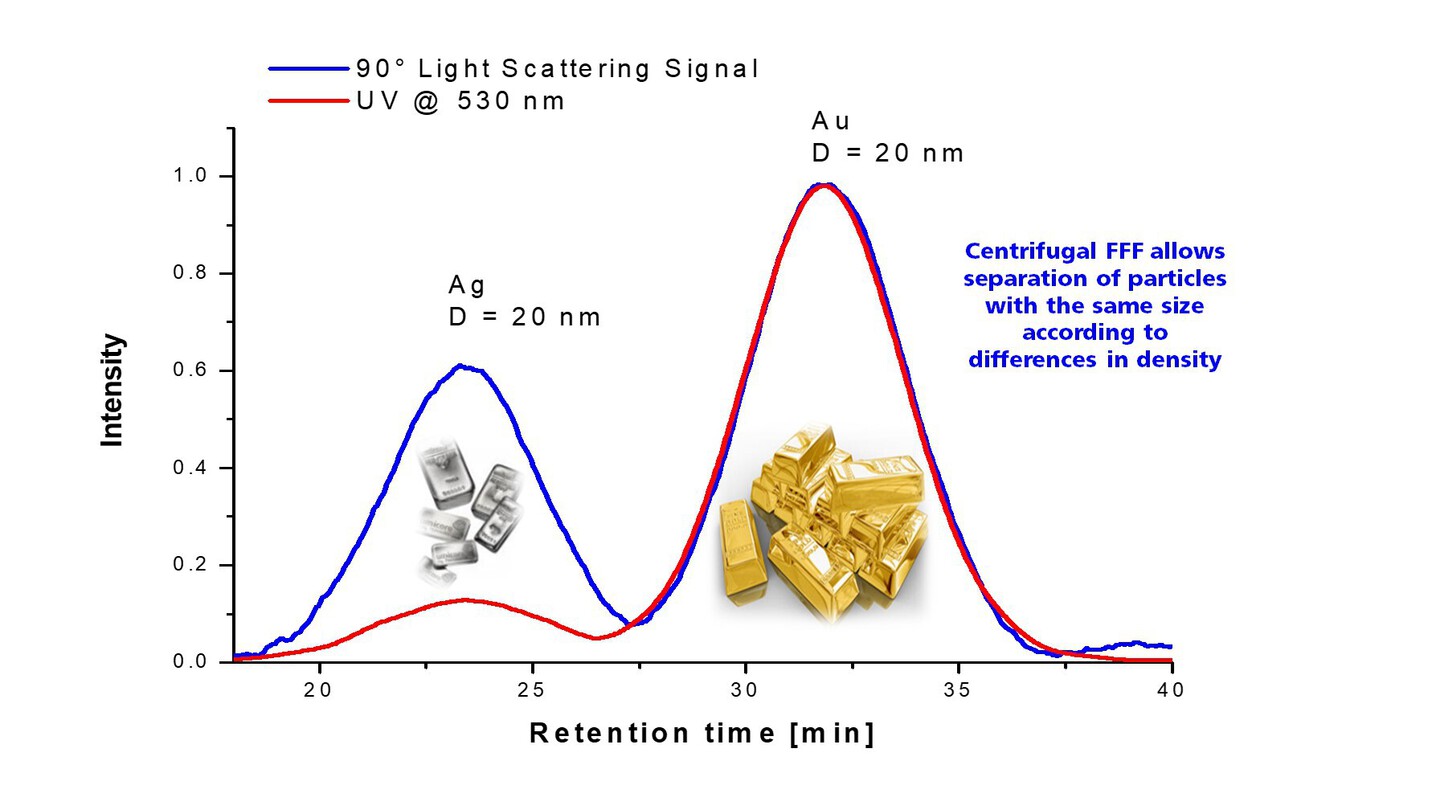 遠心FFF はサイズと密度で分離するため、同じサイズの粒子であっても化学組成と構造が異なるものを分離することができます。