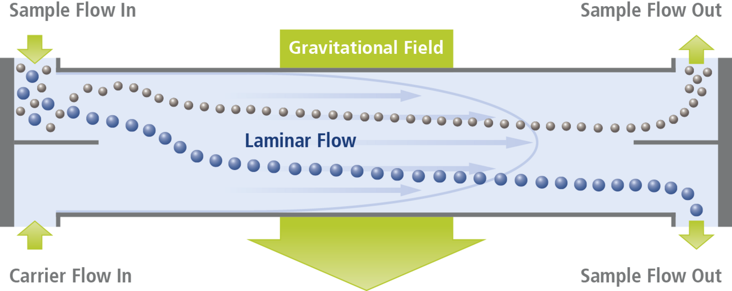 このフィールドの影響を受ける粒子は、粒子サイズと密度の両方に基づいて動的拡散によって分離されます。