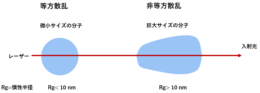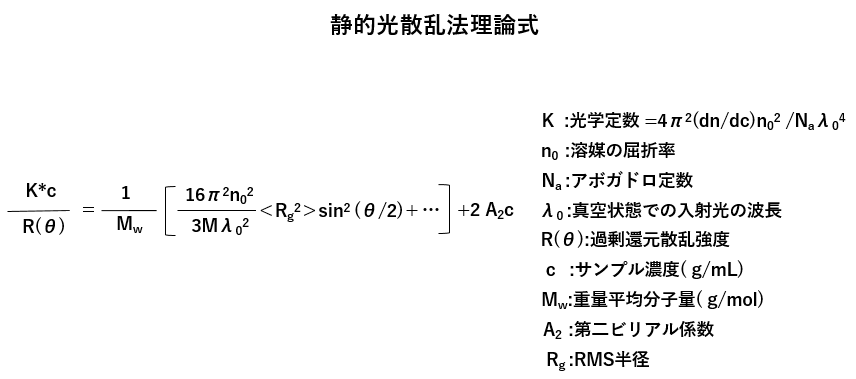 この光散乱法の特徴は、分子量既知の標準物質を必要としない絶対分子量測定法であることです。