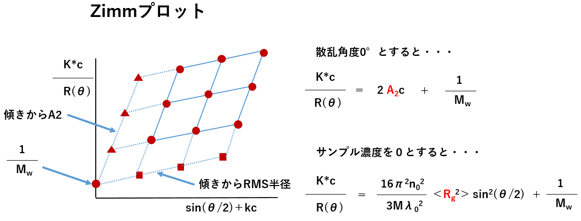 また、サンプル濃度を変えていくつかの角度での光散乱を測定し、K*c/R(θ)を縦軸に、sin2(θ/2)+kc(kは任意の定数)を横軸にプロットしたものをZimmプロットと言います。