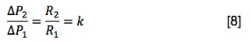 - ベースライン条件下では、純粋な溶媒が R 1と R 2の両方を流れます。したがって、両方のキャピラリーの粘度は等しくなり、相殺されます。キャピラリーは直列であり、液体は非圧縮性であるため、流量 Q 1と Q 2も等しくなり、相殺されます。これは次のとおりです。