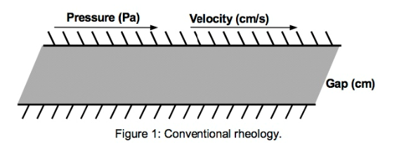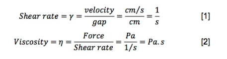 - 粘度の従来の定義は、材料にかかる圧力を材料のせん断速度で割った比率です。