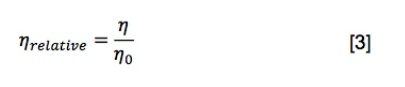 - 相対粘度 (η relative ) は、単純に 2 つの測定値の比率です。ここで、η はポリマー溶液の粘度であり、η0 は純粋な溶媒の粘度です。