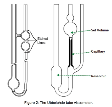 従来のガラス製キャピラリー チューブまたはウベローデ チューブ (図 2) 粘度計を使用して、試験液が既知の直径のキャピラリーを 2 つのマークされた点の間を流れるのにかかる時間を測定します。