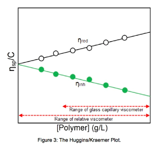 さらに、ガラスキャピラリー粘度計は非常に低い濃度では操作できないため、Hugginsプロット (Figure 3)にいくつかの濃度を使用して、ゼロ濃度に外挿して固有粘度を導き出す必要があります。