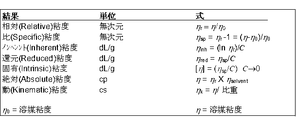 - ポリマー溶液の粘度は、純粋な溶媒の粘度に対して測定されます。