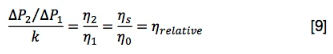 - 流路にはサンプルループが含まれていますが、キャピラリーは依然として直列であるため、Q 1と Q 2は等しくなり、相殺されます。相対粘度の式は、次のようになります。