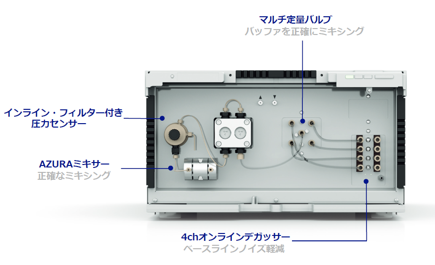 KNAUER社の0.01~1,000ml/mlの幅広い流量範囲に対応した、高精度な高圧ポンプは、様々なアプリケーション向けの液体クロマトグラフィーシステムを提供可能にしています。