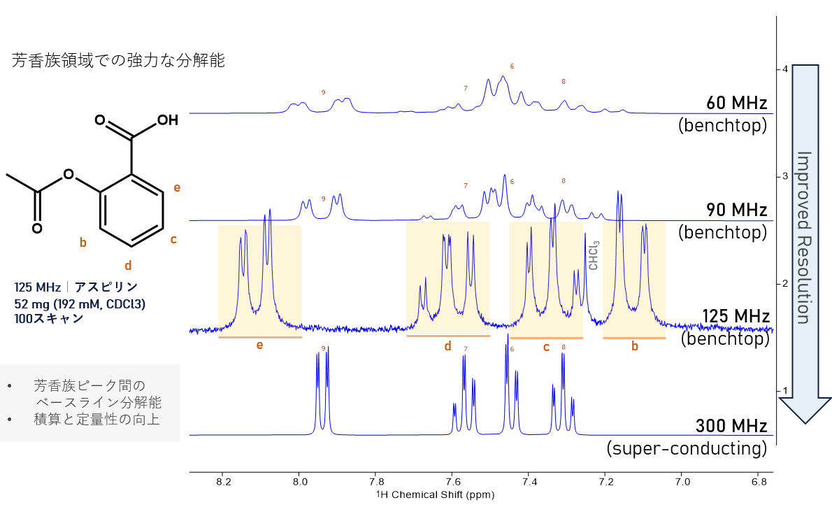 他の60/90MHzの卓上型NMRに比べて、分解能が向上しております。
