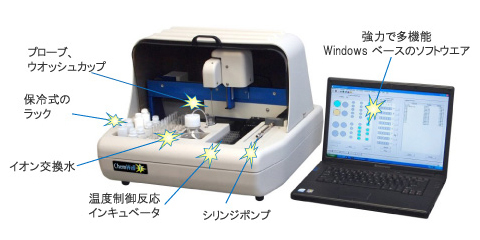 生化学とイノムアッセイを全自動かつランダムに行う分析装置です。