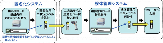 - 患者の検体情報(患者ID、採取日、患者名等)を入力することで匿名化を行い二次元コードラベルを印刷します。