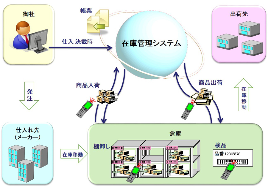 - ハンディターミナルを用いて在庫の入出荷情報を管理します。